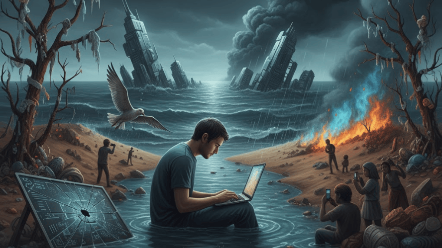Bagian lain yang juga tajam dalam mengkritik sikap manusia modern muncul dalam kalimat “cendekia kau anggap jenaka, durhaka kau di hadapan data”. Bagian ini secara langsung menyoroti fenomena yang sangat relevan di era modern: penolakan terhadap fakta ilmiah tentang perubahan iklim. Di zaman informasi seperti sekarang, penolakan terhadap data dan penelitian ilmiah justru menjadi hambatan terbesar dalam mengatasi krisis iklim. Kritik ini kemudian diakhiri dengan pesan yang tegas: “yang kau bangun sekarang, semua fana”, yang menegaskan bahwa cara pembangunan saat ini tidak akan bertahan lama.